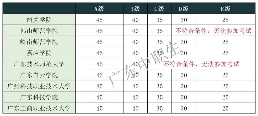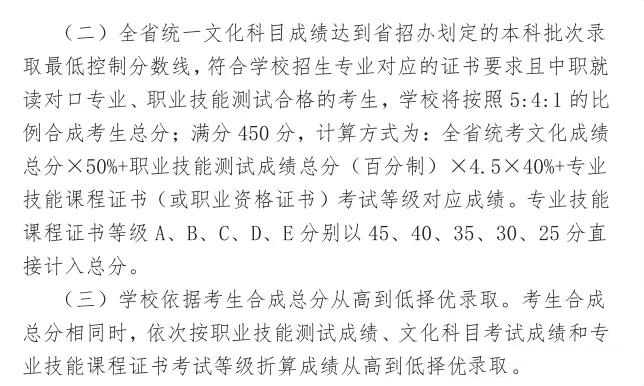 3+证书成绩怎么录取成绩怎么算?专科录取成绩为三科文化科成绩之和,而本科较为复杂一些,一起来看: “3+证书”本科批次院校遵循顺序志愿投档原则。在本科批次录取最低控制分数线上,省招生办根据考生填报志愿,将符合招生专业对应的专业技能课程证书要求且中职就读对口专业、职业技能测试考核合格的考生,投档给高校,由高校按照5:4:1的比例(全省统一文化科目考试成绩占50%、职业技能测试考核成绩占40%、专业技能课程证书考试等级折算成绩占10%)合成总分(满分450分),择优录取。 专业技能课程证书考试等级折算成绩占总分的10%即45分,证书等级A、B、C、D、E分别折算为45、40、35、30、25计分;取得护士资格考试合格证明或护士执业证书折算为45计分。 本科成绩由3部分合成:语数英成绩、技能证书等级折算成绩、技能考核成绩。 分数占比:总分是450分,文化分50%,技能测试40%,技能证书10%。 1个月快速领证,通过率高 随时可报,考证次数多多 可用于24年3+证书志愿填报 语数英成绩占50% + 职业技能测试考核成绩占40% + 专业技能课程证书考试等级折算成绩占10%合成总分(满分450分) 语数英文化课成绩占50% 因为语数英的总分和合成的总分是一样450分,所以直接用自己的语数英成绩×0.5就能得出合成语数英的成绩了。 技能测试成绩占40% 因为总分450分,技能测试占比40%,所以满分是180分。技能测试的总分是100分,我们按照比例理解就是一分就等于1.8分。用自己技能测试的成绩×1.8就是技能考核的占比成绩了。 技能证书等级折算成绩占10% 专业技能课程证书考试等级折算成绩占总分的10%即45分,证书等级A、B、C、D、E分别折算为45、40、35、30、25计分;取得护士资格考试合格证明或护士执业证书折算为45计分。 假设:张三文化成绩考了260分,他考了护士资格证,本科技能测试80分那么他的合成的总分是: 260*50%+450*10%+80*450*40%/100 =130+45+80*1.8 =130+45+144 =319分 专业技能课程证书考试等级成绩 按以下等级对应方式计入 广东省教育考试院组考和颁发的专业技能课程证书考试等级成绩按以下等级对应方式计入:A级对应45分,B级对应36分,C级对应27分。 广东省职业技能鉴定指导中心组考和颁发的中级以上(含中级)职业资格证书(西式面点师、西式烹调师、中式面点师、中式烹调师)按以下等级对应方式计入:高级技师(国家职业资格一级)对应45分,技师(国家职业资格二级)对应36分,高级(国家职业资格三级)对应27分,中级(国家职业资格四级)对应18分。 按以下等级对应方式计入 按以下等级对应方式计入 广东省教育考试院组考的专业技能课程证书等级B折算为40分、等级A折算为45分,广东省职业资格鉴定中心组考的职业资格证书中级折算为40分、中级以上折算为45分。 专业技能课程证书考试等级成绩 按以下等级对应方式计入 专业技能课程证书等级(或护士执业资格考试成绩等级)A、B、C、D、E分别以45、40、35、30、25分直接计入总分。其中护士执业资格考试成绩按专业实务和实践能力两项的平均分进行分级,分数区间340以上、[330,340)、[320,330)、[310,320)、[300,310)分别为A、B、C、D、E级。 专业技能课程证书考试等级成绩 按以下等级对应方式计入 广东省职业技能鉴定指导中心组考和颁发的中级以上(含中级)职业资格证书(西式面点师、西式烹调师、中式面点师、中式烹调师)按以下等级对应方式计入:高级技师(国家职业资格一级)对应45分,技师(国家职业资格二级)对应36分,高级(国家职业资格三级)对应27分,中级(国家职业资格四级)对应18分。 专业技能课程证书考试等级成绩 按以下等级对应方式计入 广东省教育考试院组考和颁发的专业技能课程证书考试等级成绩按以下等级对应方式计入:A级对应45分、B级对应40分、C级35分、D级30分、E级25分。 教育部考试中心组考和颁发的全国计算机等级证书按以下等级对应方式计入:二级证书对应45分,一级证书对应36分。 专业技能课程证书考试等级成绩 按以下等级对应方式计入 专业技能课程证书考试等级成绩 按以下等级对应方式计入 专业技能课程证书考试等级成绩 按以下等级对应方式计入 6月要考试了 中职技能课程证书备考必刷 赶紧领取吧