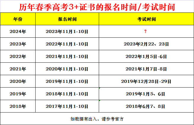 “3+证书”考试是广东春季高考的一部分,语数英文化科考试时间为每年的春季1月,但考试日期并非固定,考试前一个月考试院会公布具体日期。