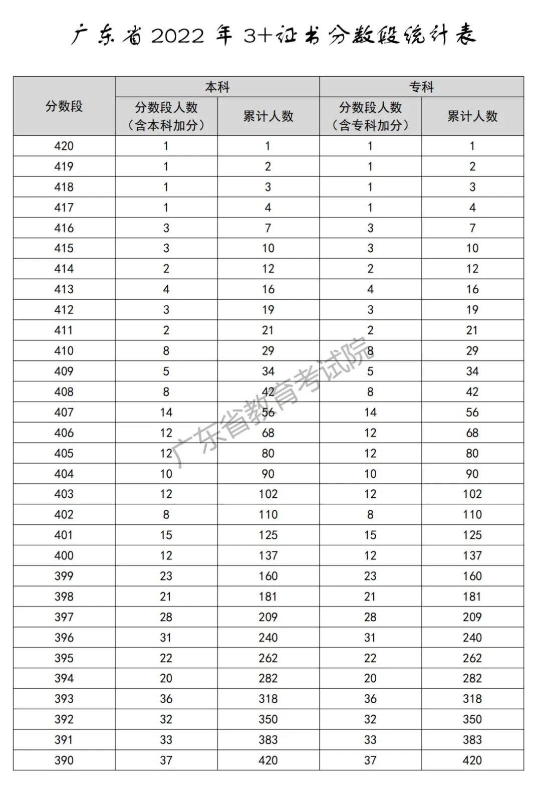 2022年3+证书总考生超12万人,该年最高分为420分1人,400分以上137人,专科300分以上11559人,80分以上122041人。300分以上考生占总考生人数的9.63%。