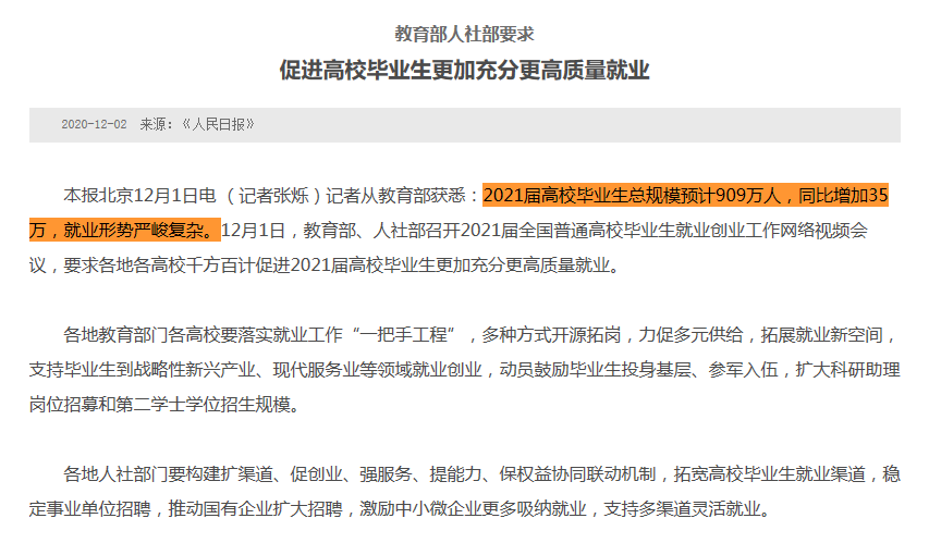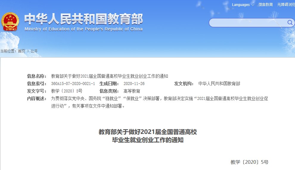 党的十九届五中全会强调,强化就业优先政策,千方百计稳定和扩大就业,完善重点群体就业支持体系。促进高校毕业生就业是就业工作的重中之重。2021届高校毕业生就业形势复杂严峻,就业工作任务艰巨。为贯彻落实党中央、国务院“稳就业”“保就业”决策部署,教育部决定实施“2021届全国普通高校毕业生就业创业促进行动”,进一步完善高校毕业生就业支持体系,全力促进高校毕业生更加充分更高质量就业,服务加快构建以国内大循环为主体、国内国际双循环相互促进的新发展格局。现就有关事项通知如下。