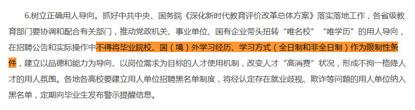 6.树立正确用人导向。抓好中共中央、国务院《深化新时代教育评价改革总体方案》落实落地工作,各省级教育部门要协调和配合有关部门,推动党政机关、事业单位、国有企业带头扭转“唯名校”“唯学历”的用人导向,在招聘公告和实际操作中不得将毕业院校、国(境)外学习经历、学习方式(全日制和非全日制)作为限制性条件,建立以品德和能力为导向、以岗位需求为目标的人才使用机制,改变人才“高消费”状况,形成不拘一格降人才的用人氛围。各地各高校要建立用人单位招聘黑名单制度,将经认定存在就业歧视、欺诈等问题的用人单位纳入黑名单,定期向毕业生发布警示提醒信息。