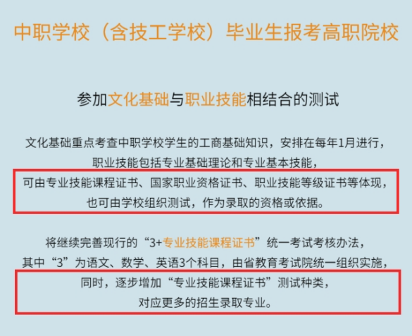 大撕兄用红色框标注的这部分:将逐步增加“专业技能课程证书”测试种类,对应更多的招生录取专业。