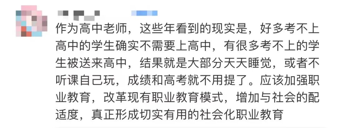 二、“普职分流”五五开比例是否科学合理值得好好讨论和观察检验,其间应允许职高生平等参加高考;