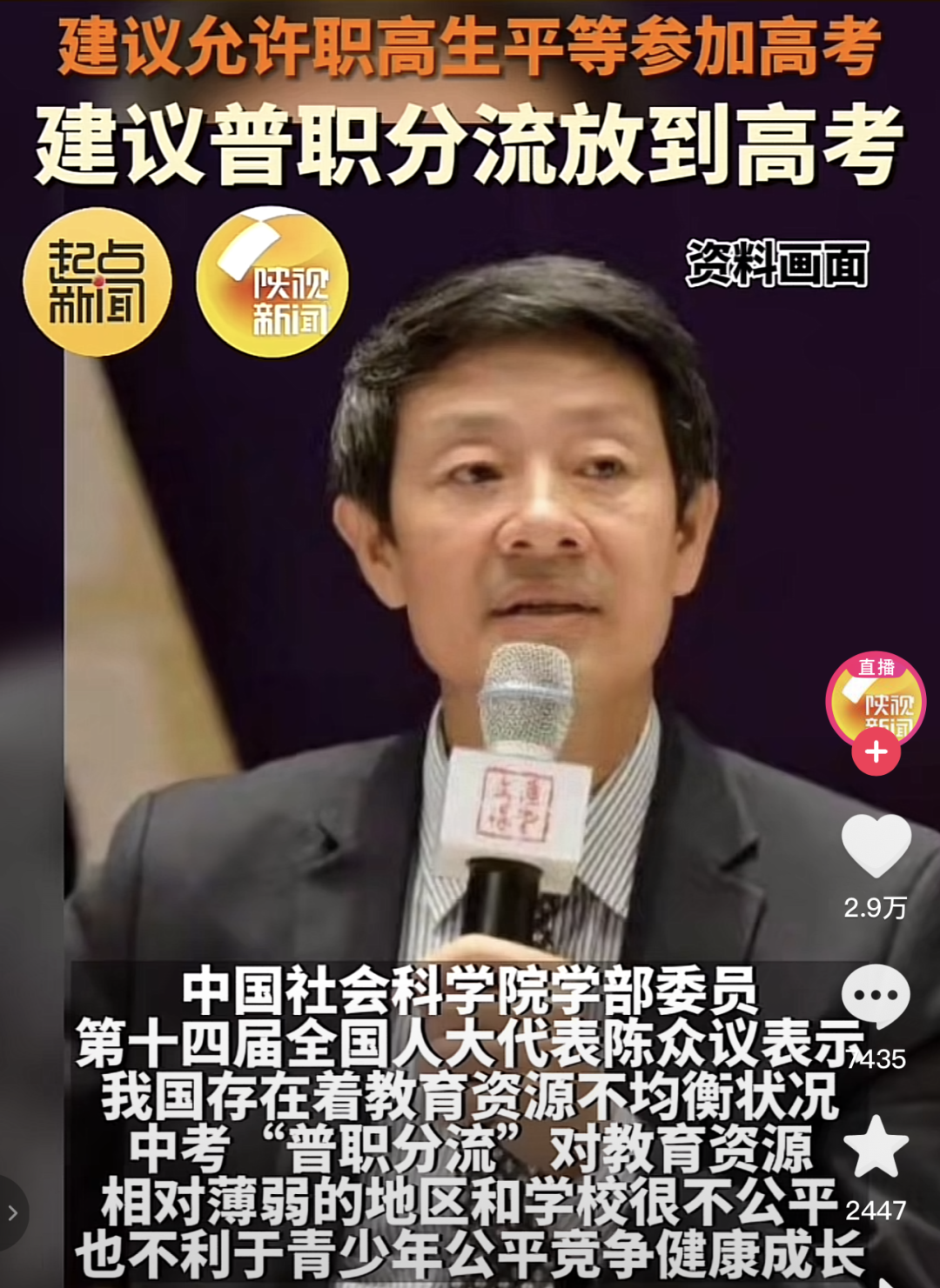 近日,中国社会科学院学部委员、第十四届全国人大代表陈众议表示,本次两会,他将就试行十二年义务教育,中考普职分流延迟到高考一事,递交建议。