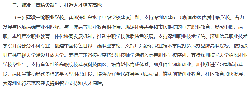 1月27日,广东省人民政府网站上发布《教育部 广东省人民政府关于推进深圳职业教育高端发展 争创世界一流的实施意见》,支持深圳职业技术学院、深圳信息职业技术学院开设部分本科专业,创建中国特色世界一流职业学校。