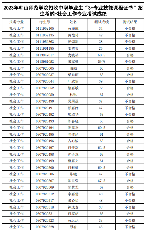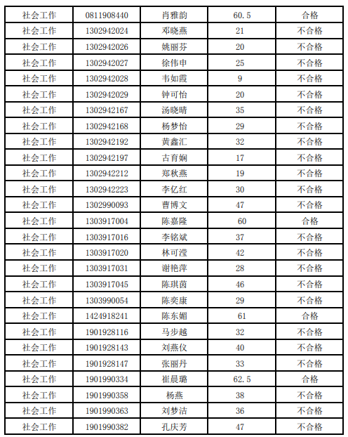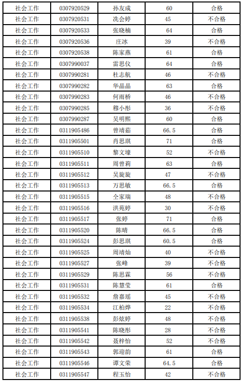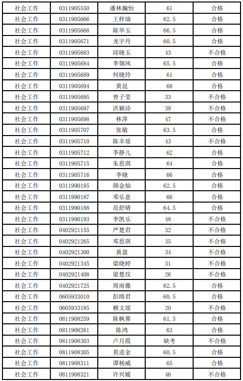 社会工作专业:共有126人报考参加技能测试,最高分71分,最低9分,60分合格。其中56人合格,有70人不合格。技能测试通过率为44.4%。