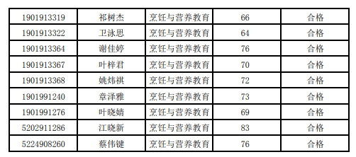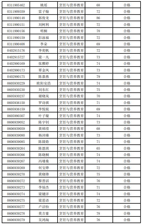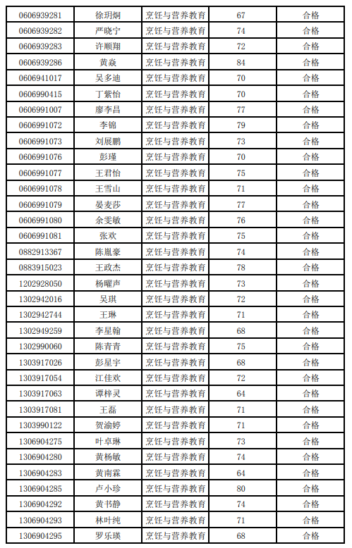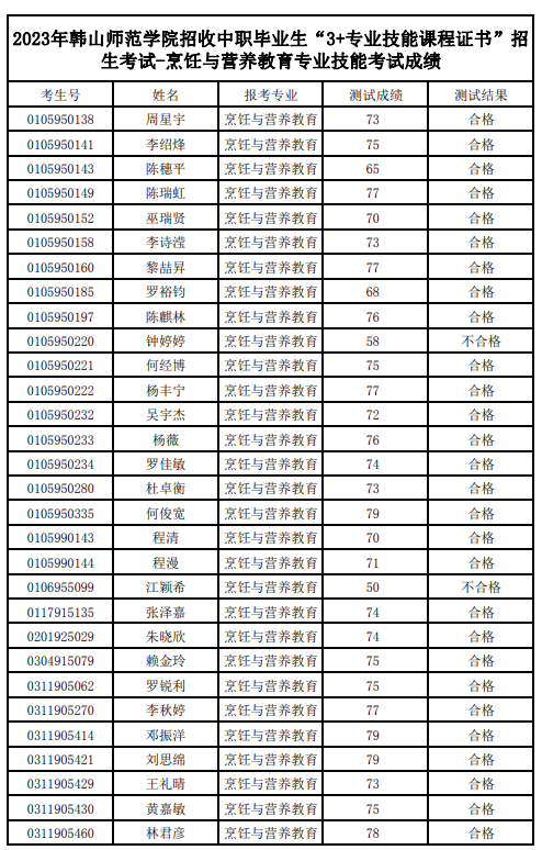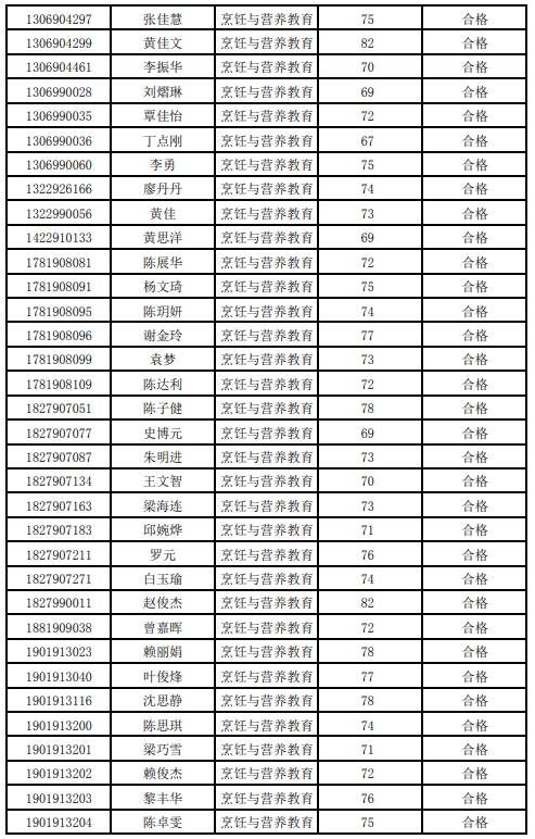 烹饪与营养教育专业:共141人报考参加技能测试,最高分86分,最低50分,60分合格。其中139人合格,只有2人不合格,技能测试通过率为98.5%。