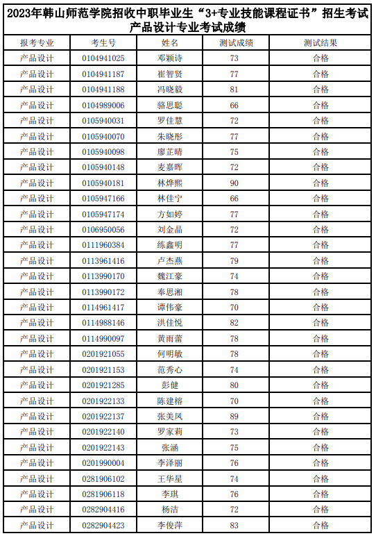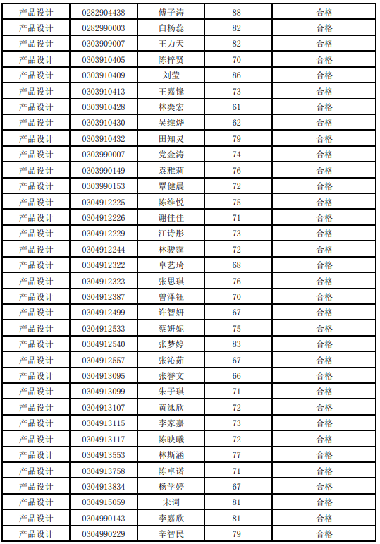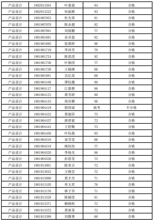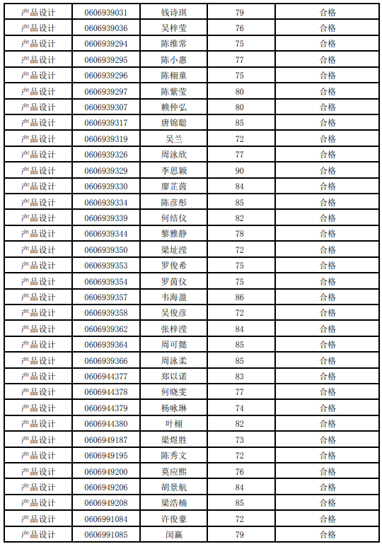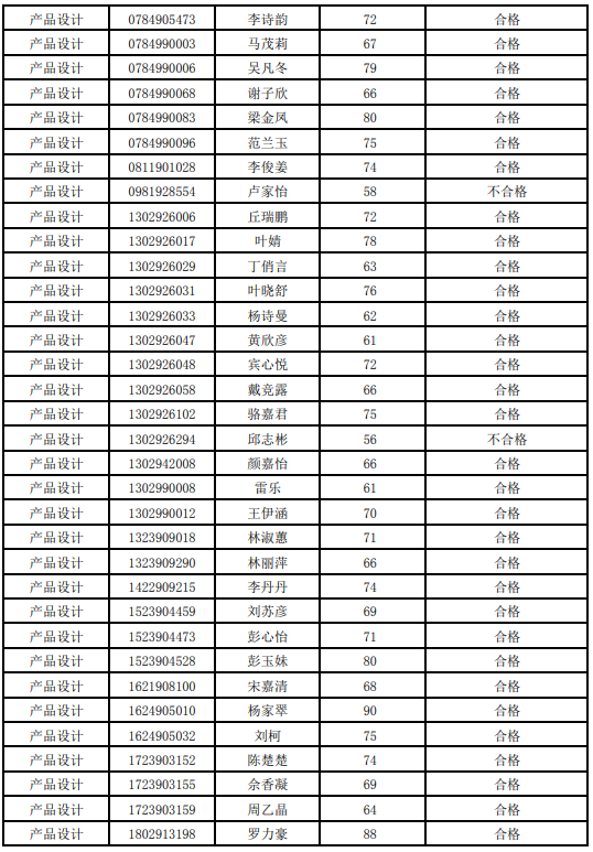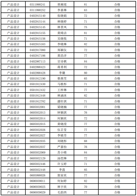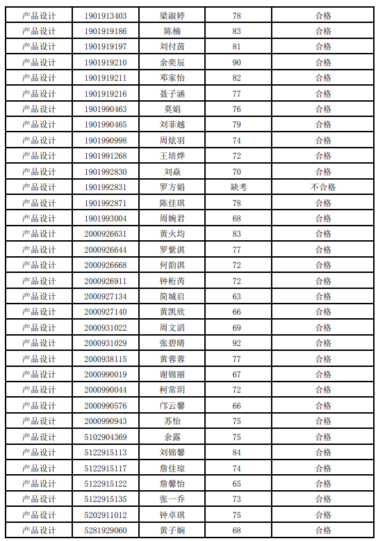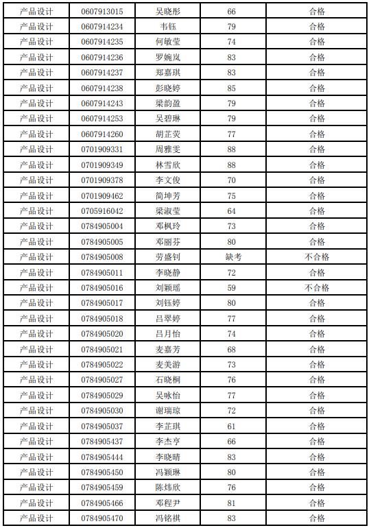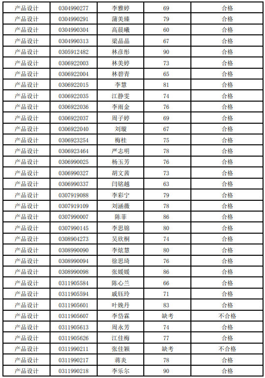 产品设计专业:共有303人报考参加技能测试,最高分92分,最低56分,60分合格。其中295人合格,有8人不合格,有缺考。技能测试通过率为97.3%。