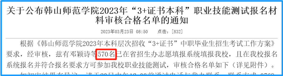 根据韩师官网发布的《关于公布韩山师范学院2023年“3+证书本科”职业技能测试报名材料审核合格名单的通知》2023年填报韩山师范学院本科的考生有570人,其中录取150人。