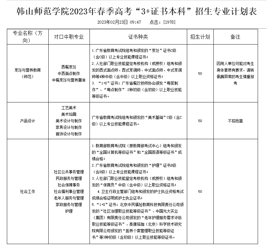 韩山师范学院有烹饪与营养教育(师范)、产品设计、社会工作,共3个本科专业面向3+证书高职高考招生,各计划招生50人,其中社会工作为2022年新增专业。