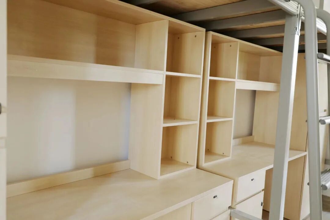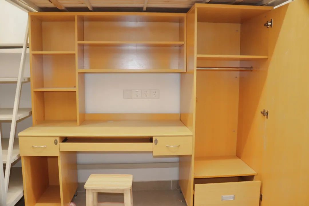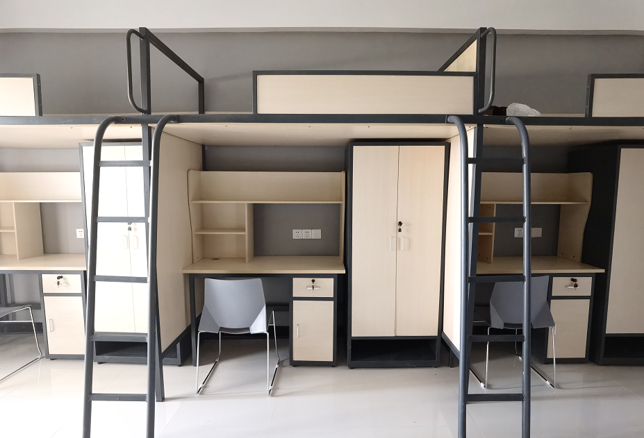 标准四人间,上床下桌,私人空间很大,桌面设计人性化,配备了分格的小柜子。独立衣柜,宿舍衣柜数量多空间大,最大化地满足储物需求。
