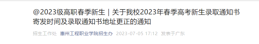 亲爱的2023级春季新生: 祝贺您成为惠州工程职业学院2023级新同学!我校2023年春季高考录取工作已结束,录取新生可通过微信公众号“惠州工程职业学院招生办”录取查询系统查询录取情况。 春季新生录取通知书将于8月与夏季高考录取通知书一同寄出,邮寄地址、联系人、联系方式均为高考报名系统中的信息,具体邮寄时间请关注我校招生微信公众号。 “依学考”、“3+证书”、“中高职三二分段”“现代学徒制”的同学如需更改《录取通知书》的邮寄信息,请于8月1日24:00前扫描下方二维码登记,逾期不再受理。 近期还能修改录取通知书邮寄信息的还有广东女子职业技术学院。 2023年●春季高考 ▼ 由于不同学校录取通知书发放时间不一 如何快速查询录取通知书 ▼ 进入菜单栏 [查录取结果] 点击[录取通知书查询] 即可进入邮政查询界面 点击录取通知书查询 输入考生号+收件人手机号后四位即可查询