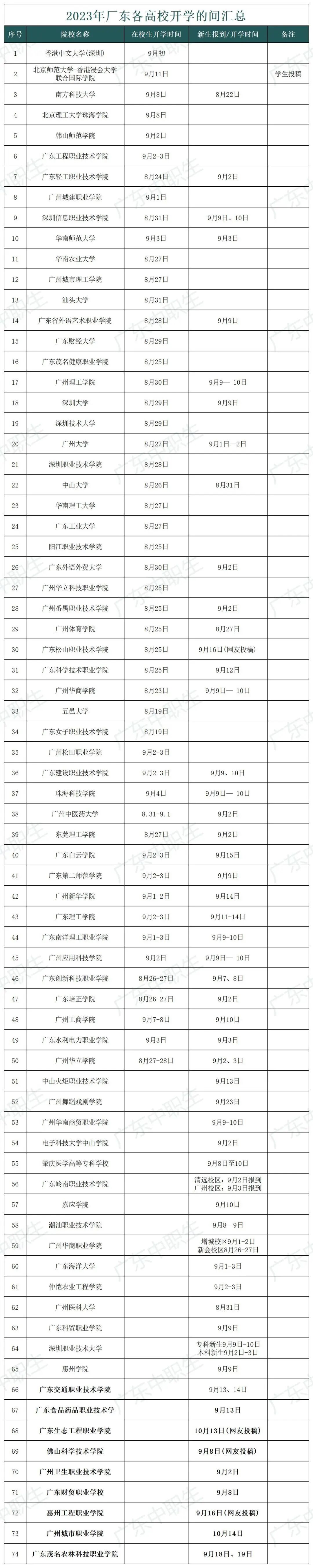 在校生开学时间: 根据目前收集到的信息来看,目前大部分的院校在校生都是集中在8月末或者9月初开学的,今年大家的开学时间基本上相差不大。 新生开学最早: 截至目前,南方科技大学新生报到时间最早,为8月22日。紧接着是广州体育学院(8月27日)、广州医科大学(8月31日)、中山大学(8月31日) 新生开学最晚: 根据网友投稿广东生态工程职业学院新生开学的时间为10月13日,其他高校新生报到一般安排在9月中旬。