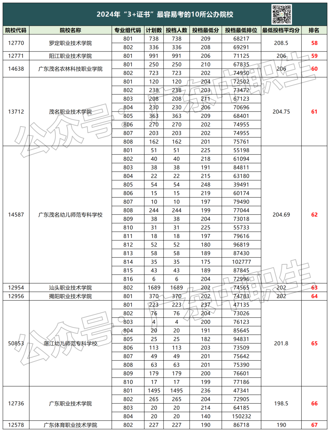 高职高考到底难不难? 想上大学的中职生到底该怎么备考? 哪些公办学校比较容易上岸? 很多同学以为,高职高考最差不过就是考个民办!省控线不是才115分,随便考考自己也有书读?! 但去年有19.6万的考生中,有7.6万的同学是没有书读的! 其中大部分同学都有130分、140分?为什么没书读! 2024年高职高考的民办录取分很高!只有少数几所只要过省控线就能报!比如广东科技学院、广州城建职业学院、广东新安职业技术学院、广东理工学院、潮汕职业技术学院、惠州经济职业技术学院、私立华联学院没个160分,根本没有机会读!!! 在每4个人里,就有1个人直接没有书读的竞争中,高职高考你还没开始打算复习吗? 很多同学都只想读公办,为什么呢?非常直接的原因,民办学费太高了! 根据24年的录取分数来看,公办的录取分数线大致在230分左右,像热门头部的基本要320+才能上!整体所有院校的所有专业组录取平均分为252分! 而热门民办的平均分在140分左右!只要努力多100分,你就有机会考上更好的大学!! 24年有12万中职生考上高职高考,其中6.8万去了公办,5万去了民办,也就是2个人里,就有1个可以去公办,为什么不能是你! 从以下“分数段人数”可知,每进步50分,能够超越的可能是上万人!这句话真的不是空话!是有依据的! 比如,150-199分有5.9万人,如果你能从150分提到199分,这5万人都将在你的后面!你能够挑选的院校也将翻倍! 每一个50分都等于你的选择又多了5个学校!你能够去到的校园氛围、学习环境将会是更不一样! 根据2024年3+证书的录取投档情况显示,公办专科一共67所,综合排名后列出了最后10所,如下: 2024年3+证书最容易考的10所公办院校分别是:罗定职业技术学院、阳江职业技术学院、广东茂名农林科技职业学院、茂名职业技术学院、广东茂名幼儿师范专科学校、汕头职业技术学院、揭阳职业技术学院、湛江幼儿师范专科学校、广东职业技术学院、广东体育职业技术学院。 其中,录取分数综合平均分最低的是广东体育职业学院,平均190分,排位在86718。 这10所院校中广东职业技术学院的专业组804的分数最低140分。 有同学问最容易考的不应该是最低分的那几个专业组吗? 不一定,大家看2024年最低分的专业组是广州卫生职业技术学院的804专业组125分,仅比省控线高了10分。 但我们看广州卫生职业技术学院其它专业组分数不低。最低投档平均分排名45,2024年最高分的一个专业组是285分,平均下来都贴近217分左右。 你准备好要迎战高职高考了吗?距离2025年高职高考仅剩下8个月!那如何高效备考? 面对越来越严峻的3+证书高职高考情况,该如何应对?最直接也最快见效的方法就是报班。 如果基础不好,自律性不高,学习无从下手,或者没有一个比较适合沉浸学习的环境,大撕兄建议考生可以考虑报班学习。 一方面,本身基础就不好的同学,需要加快进度巩固基础,改进学习方法,来实现短期高效的提高成绩,争取提高录取成功率。 另一方面,对于备考的人来说,学习环境是很重要的,一个有学习氛围、有共同目标的学习群体,可以让考生带来一定的压力,促进考生更快进入备考状态。 此外,辅导班会有专业的老师教学监督,有任何问题都可以及时得到解答;还有定时的模拟考试,也能够让考生发现自己的短处,及时查漏补缺,同时多次的考试模拟是考生适应未来即将面对的正式3+证书高职高考,避免高度紧张到极致发挥失常的情况。