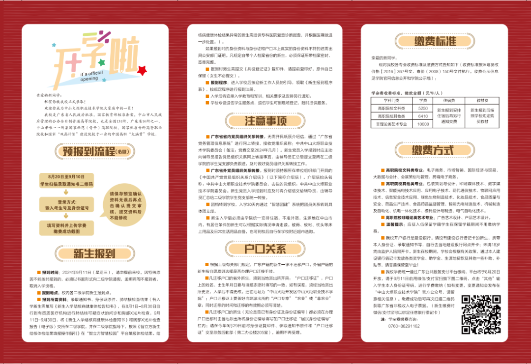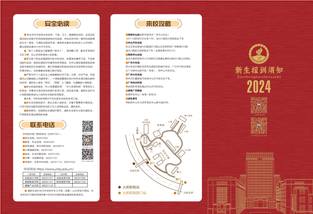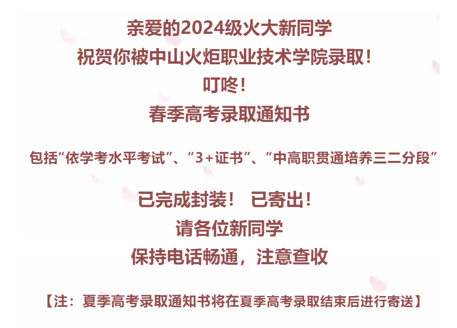 (2023年茂名农林录取通知书,图源小红书博主:顺风顺水free 6372483894) EMS邮封 EMS封套为定制版 — ZSTP为学校Zhongshan Torch Polytechnic缩写,融合了中山和学校的地标元素,如孙中山像、孙中山故居、天下为公、火炬、校门、学校操场、读书廊等。 立德、明志、精业、惟新,作为一所脱胎于“国家火炬计划”高技术产业的高职院校,中山火炬职业技术学院自2004年成立以来,始终立足中山火炬开发区,让专业群对接产业群,让人才链对标产业链,让双创教育协同双创孵化,让特色党建链接地方经济,为职业教育高质量发展探索出与园区深度融合的“中山火炬模式”。 通知书封套 录取通知书封套的绳结巧妙编织,犹如时间的细密针脚,串联起二十载春秋。它不仅见证了火大20年来的岁月沉淀,更寓意着火大学子将与这片土地共同书写未来的辉煌。每一股绳线,都承载着火大的智慧与期望,每一处交织,都预示着火大学子将在火大的引领下,开启人生的新篇章。 二十载特色发展,二十载岁月流金。今年是中山火炬职业技术学院20周年校庆。二十年前,学校孕育于“国家火炬计划”,由中山市人民政府举办,委托中山火炬高技术产业开发区管理,创造了“当年申报、当年获批、当年招生”的高职奇迹。 通知书内页 邮寄内含清单 《新生入学须知》提供了学校简介、预报到流程、缴费指南、入学注意事项、党团组织关系、户口关系、咨询方式、来校攻略等内容介绍。请新生按“报到所需资料”项的要求备齐资料。 ①开学典礼要你C位登场!新生发言代表征集令 ②中山火炬职业技术学院2024级学生开学典礼新生发言代表报名表 ③生源地信用助学贷款申请指南 ④2024年资助学评选时序宣传单 ⑤心理咨询中心致2024级新生的一封信 ⑥“ZSTP掌上学工”新生注册须知 ⑦各校级学生组织宣传资料 另附:智立方新生结核体检结果填报操作指引、新生入学结核病健康体检告知书 我校2024年春季高考新生录取通知书已通过中国邮政EMS寄出,请注意查收。快件单号可通过中山火炬职业技术学院官方网站查询。 官网查询网址 https://www.zstp.edu.cn/info/1082/25516.htm 快件查询方法 各位考生可通过中国邮政快递官网 (https://www.ems.com.cn/) 查询快件信息。 或通过中国邮政速递物流录取通知书查询页面 (https://www.ems.com.cn/queryList) 输入考生号进行查询。 如何快速查到录取通知书? 以下这种方法可快速查询自己的录取通知书: 扫码关注「粤高校情报站」 ▼ 进入菜单栏 [录取查询] 点击[查询录取通知书] 即可进入邮政查询界面 点击录取通知书查询 输入考生号+收件人手机号后四位即可查询 录取通知书寄送进度可以查? 可以。如果你的学校录取通知书已经发出,在查询页面会显示你的通知书寄送进程,你可以实时查看哦!