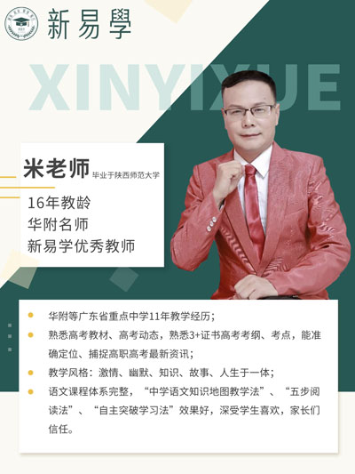 吴安琪老师毕业于华南师范大学汉语言文学专业。广东新易学教育培训有限公司骨干语文老师,教学经验极其丰富,多次参加高考阅卷,尤其擅长短期快速提升作文成绩,讲课严肃严谨中不乏幽默,极其亲和力和感染力。授课洒脱而深刻,讲课经常与同学像老朋友一样分享生活的感受,从而加深学生对阅读的思考,在教授中职学生的过程中循循善诱,启发式教学,并能不断地带给学生惊喜。